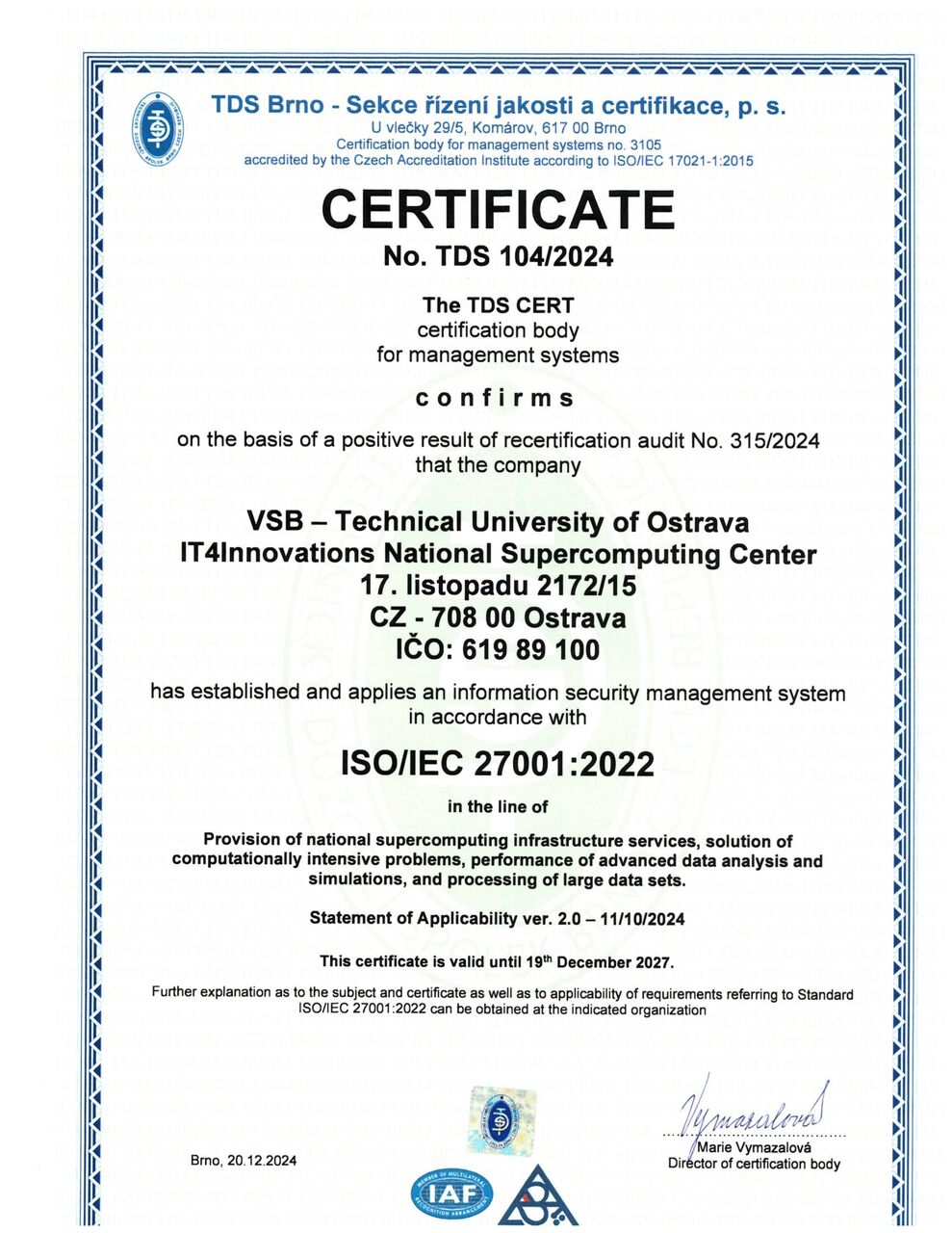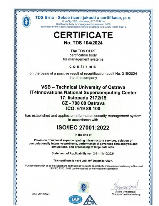 Since December 2018, IT4Innovations National Supercomputing Center has been a holder of an Information Security Management System certificate in accordance with the international ISO/IEC 27001:2022 (Czech version: ČSN ISO/IEC 27001:2023) standard.
