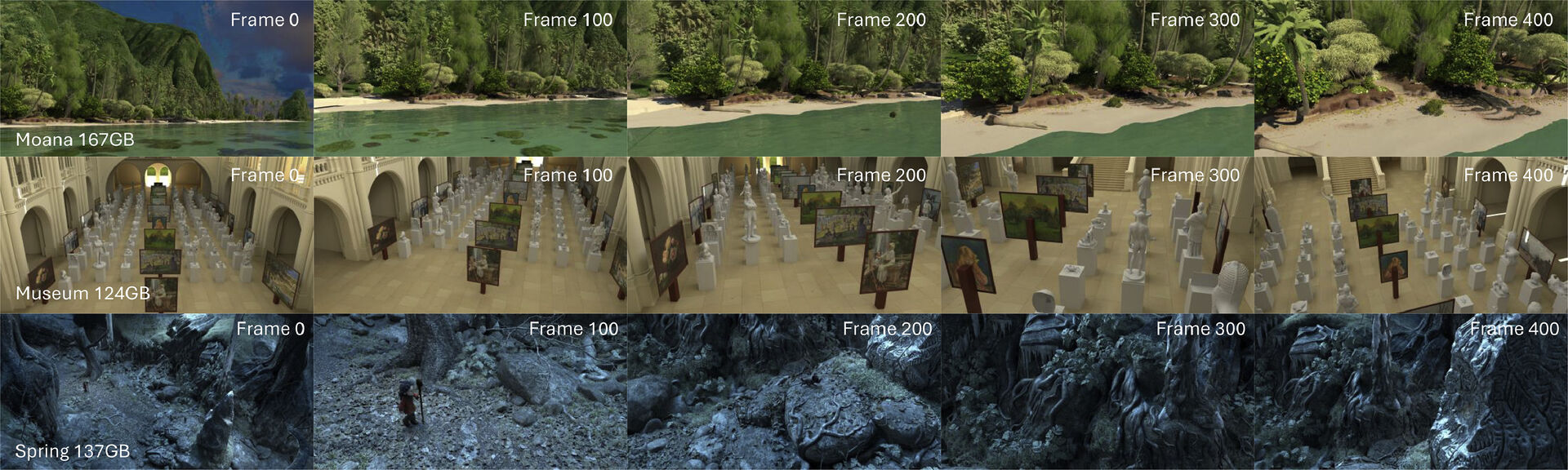 Výzkumníci zároveň navrhli strategii pro renderování animací. Systém dokáže kombinovat statistiky přístupů k datům z různých pozic kamery, což umožňuje optimalizovat práci s pamětí napříč celou sekvencí snímků. Díky tomu není nutné znovu provádět náročnou analýzu pro každý snímek.